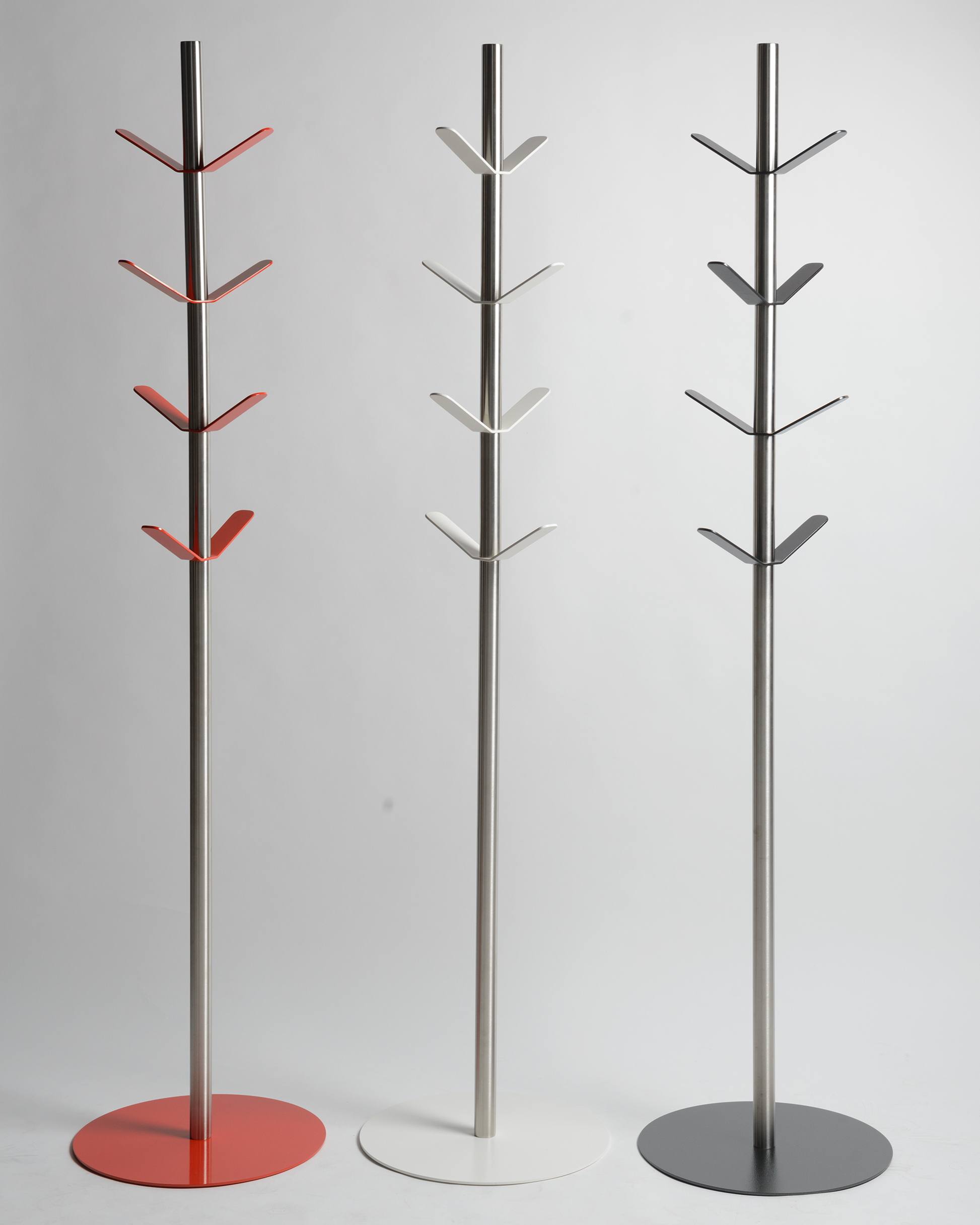 O Cabide Duo combina estrutura em inox escovado com apoios em ferro pintado, criando contraste visual equilibrado e contemporâneo.
