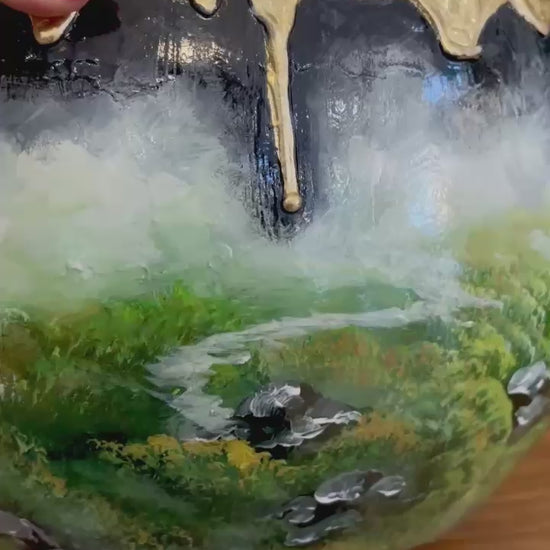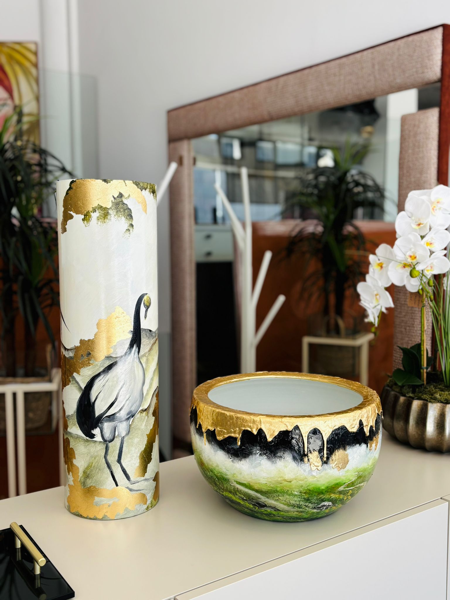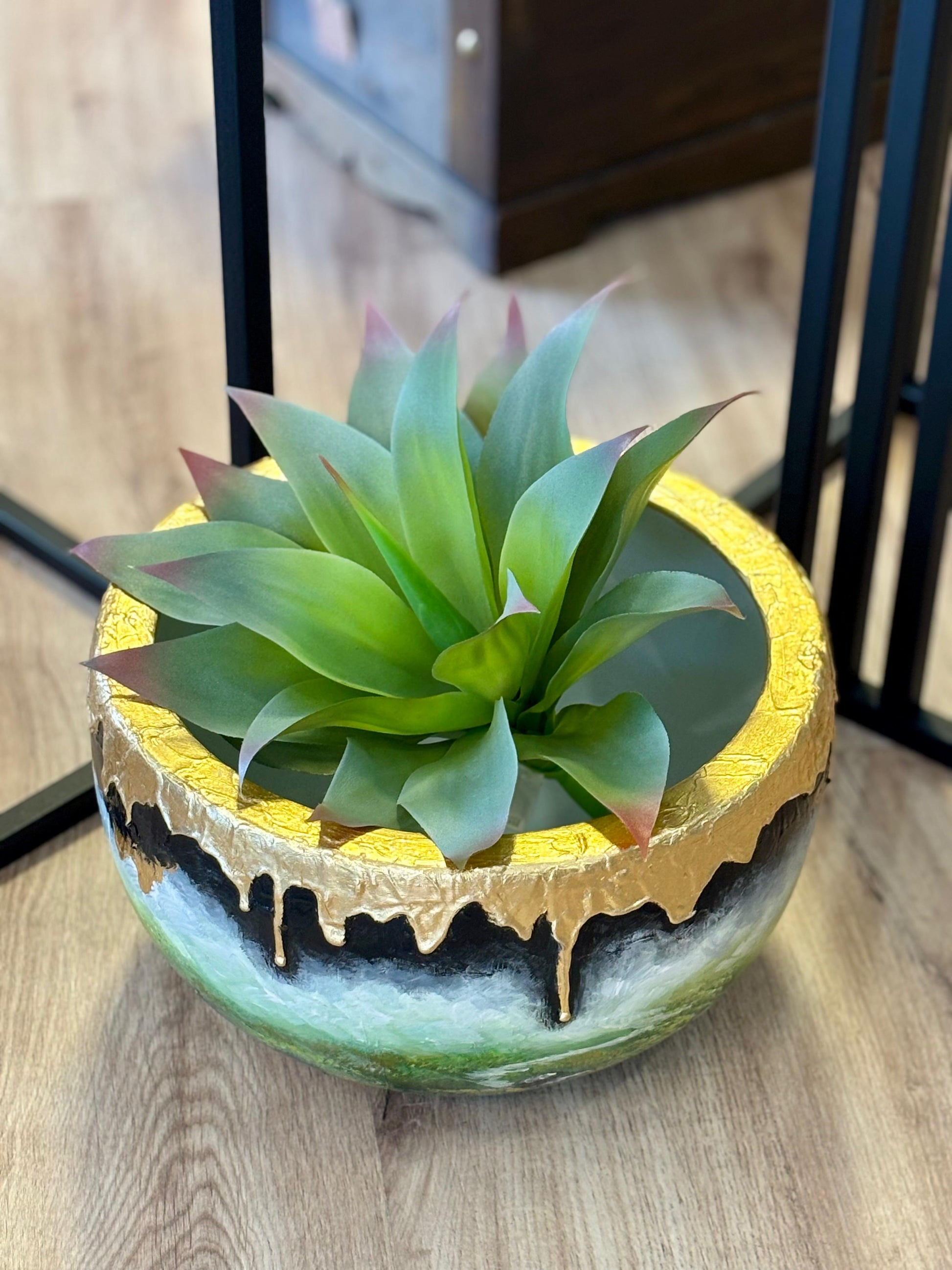 O Cachepot Aurora é uma peça decorativa pintada à mão, criada para quem valoriza detalhes únicos e acabamentos artesanais. A combinação de cores fluidas com aplicação dourada em efeito “dripping” transforma-o num elemento de destaque — perfeito para complementar ambientes modernos, glamorosos ou contemporâneos.