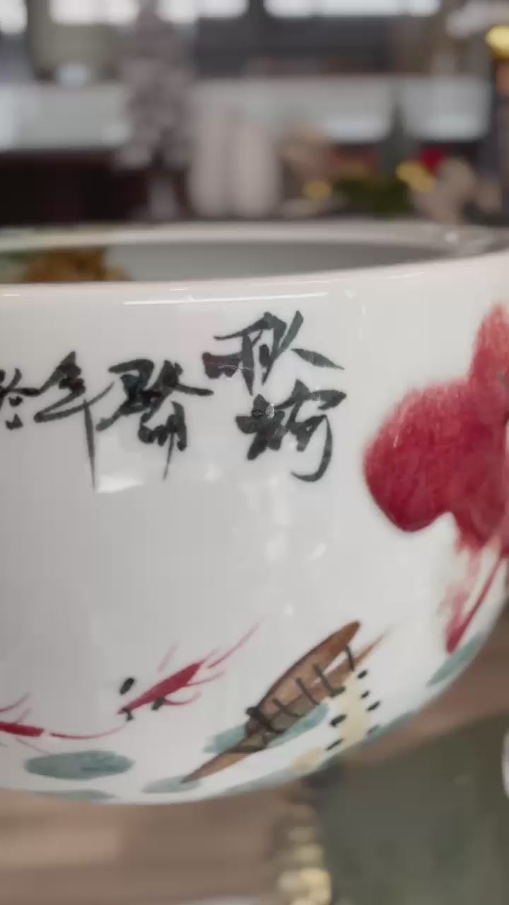 O Cachepot Oriental em Faiança Artesanal destaca-se pelos seus detalhes pintados à mão, que evocam a delicadeza da arte chinesa tradicional. As ilustrações de inspiração natural — flores, peixes e elementos orgânicos — conferem-lhe um carácter cultural distintivo e uma presença decorativa marcante.