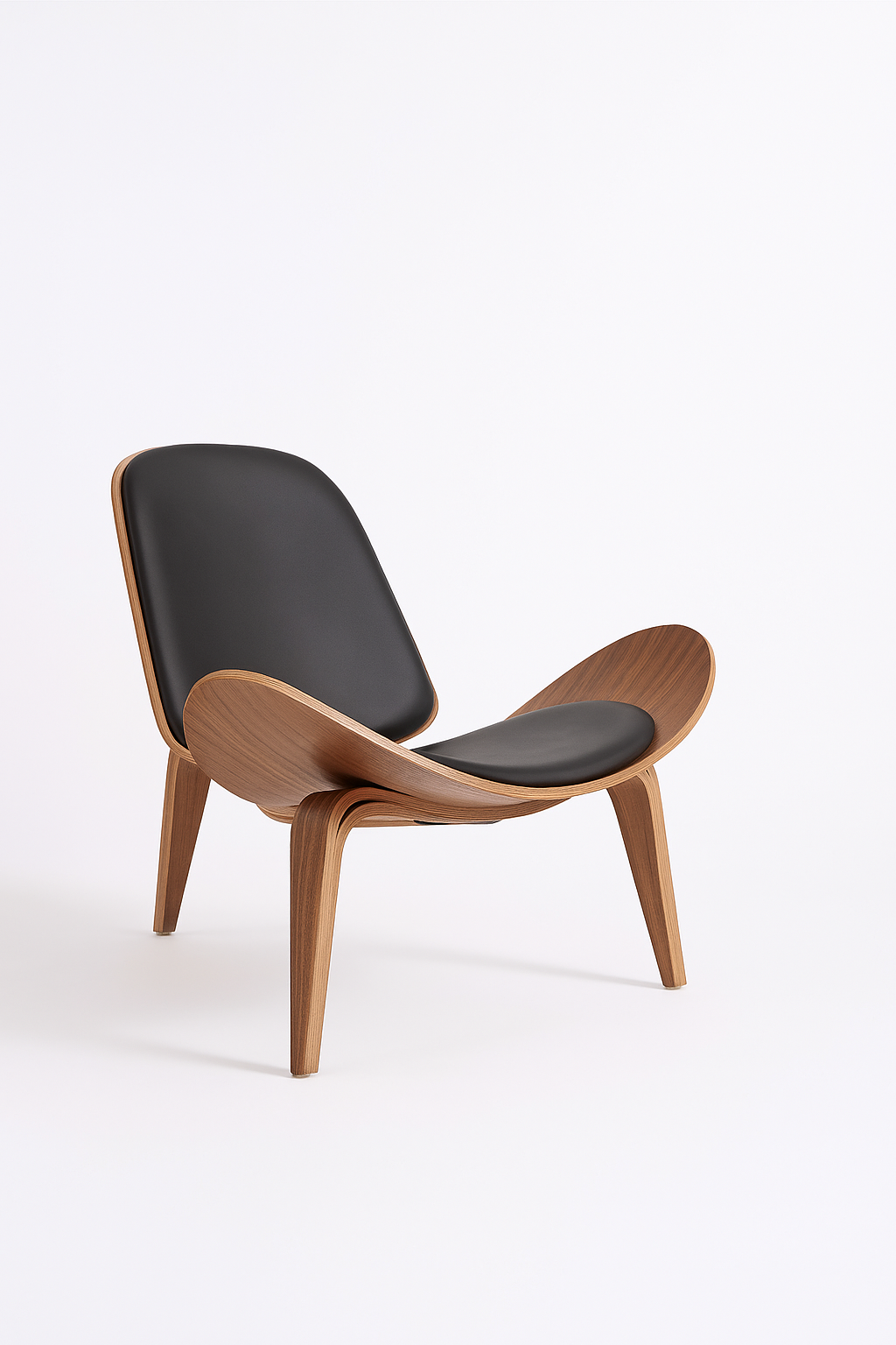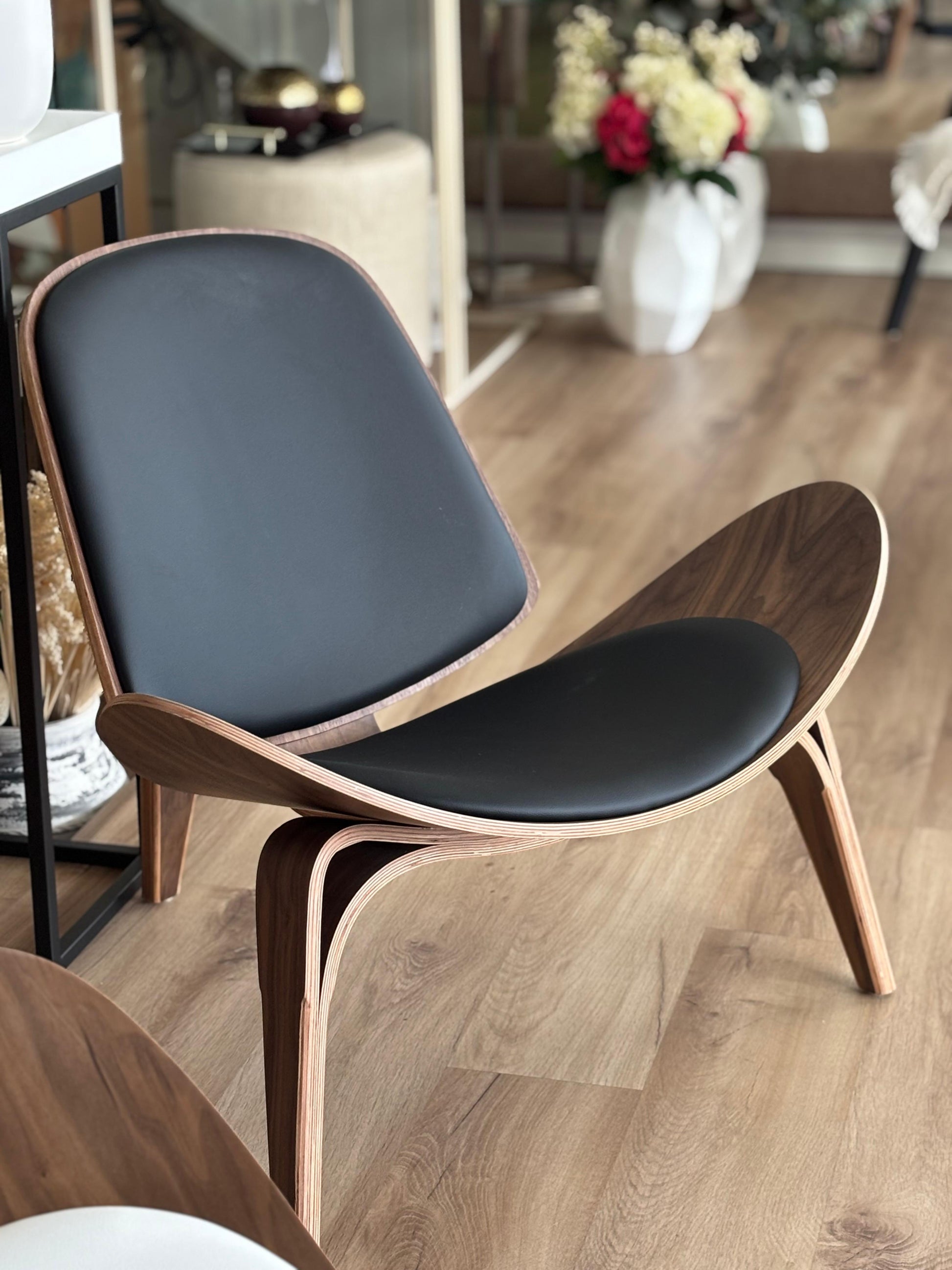 O assento e encosto em pele sintética convidam ao descanso, enquanto a estrutura em madeira curvada acrescenta uma presença escultórica e elegante ao espaço.