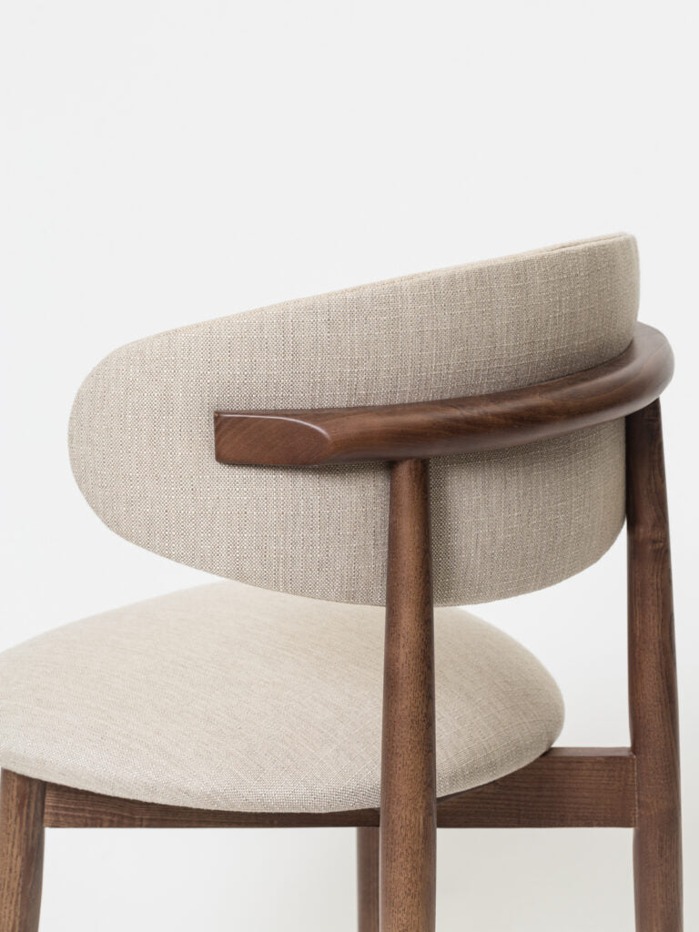 A Cadeira Contorno destaca-se pelas suas curvas suaves e pelo encosto envolvente que abraça discretamente a zona lombar, oferecendo conforto prolongado sem comprometer a estética minimalista.