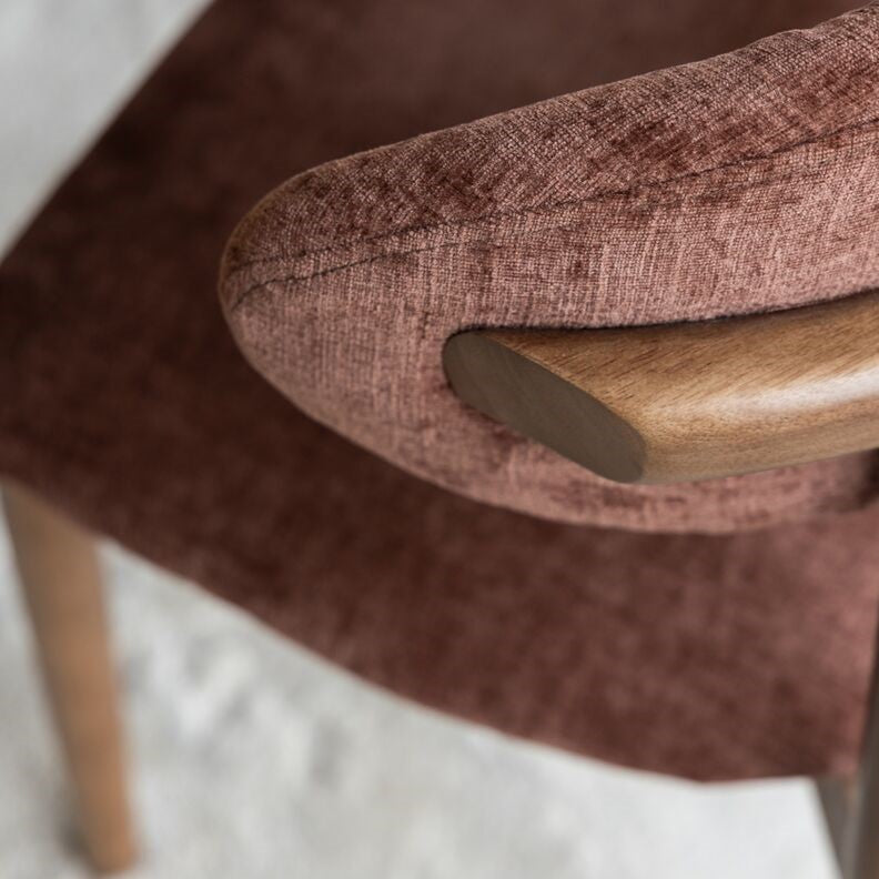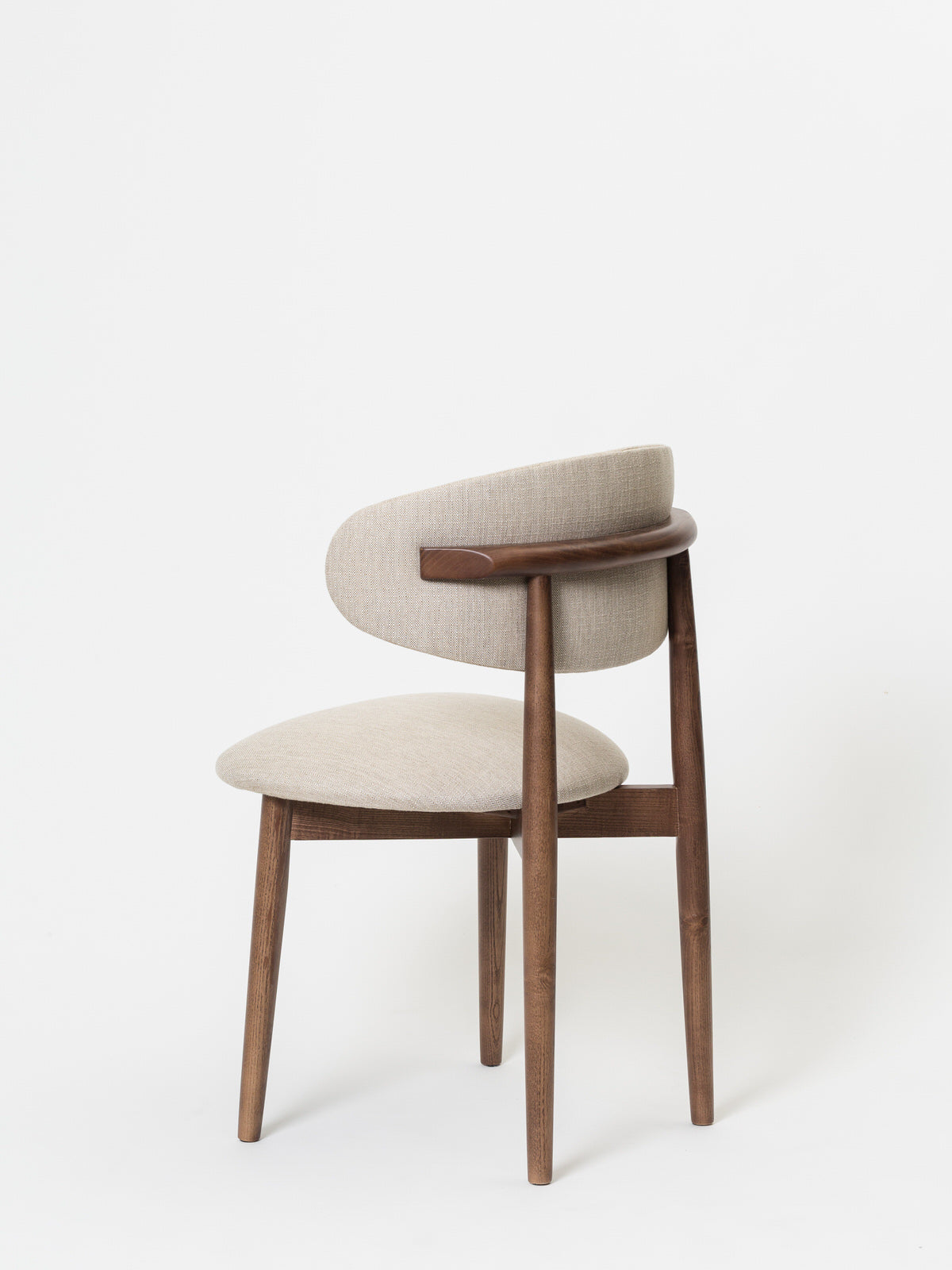 A estrutura esguia em madeira maciça acrescenta verticalidade e um charme natural, enquanto o assento arredondado suaviza a composição e torna a peça versátil para salas de jantar, espaços de convívio ou ambientes profissionais com foco no design.