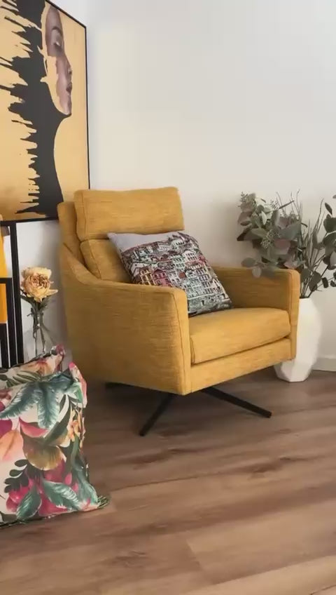O Cadeirão Kyle combina design contemporâneo com um conforto excepcional, pensado para elevar qualquer ambiente — da sala de estar ao canto de leitura. A sua base rotativa discreta permite um movimento suave e natural, tornando-o prático no uso diário sem perder a elegância.