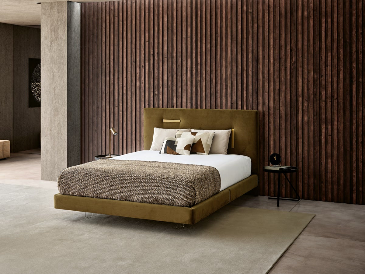 A cabeceira apresenta aplicações metálicas discretas, mas impactantes, criando um equilíbrio entre a simplicidade contemporânea e o quiet luxury de forma subtil. Os pés em acrílico transparente, conferem leveza visual e um efeito suspenso que transforma qualquer quarto num espaço moderno e exclusivo.