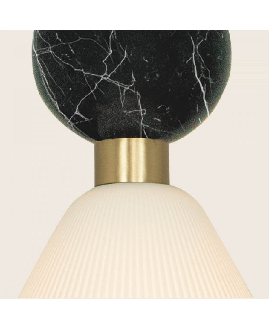O Candeeiro Suspenso Trio Noir destaca-se pela sua composição de três pontos de luz, suspensos de forma assimétrica, criando um efeito visual leve e sofisticado. A combinação da base em preto mate com detalhes em latão, mármore preto e difusores em gesso resulta numa peça de forte presença estética, mas ao mesmo tempo discreta e elegante.