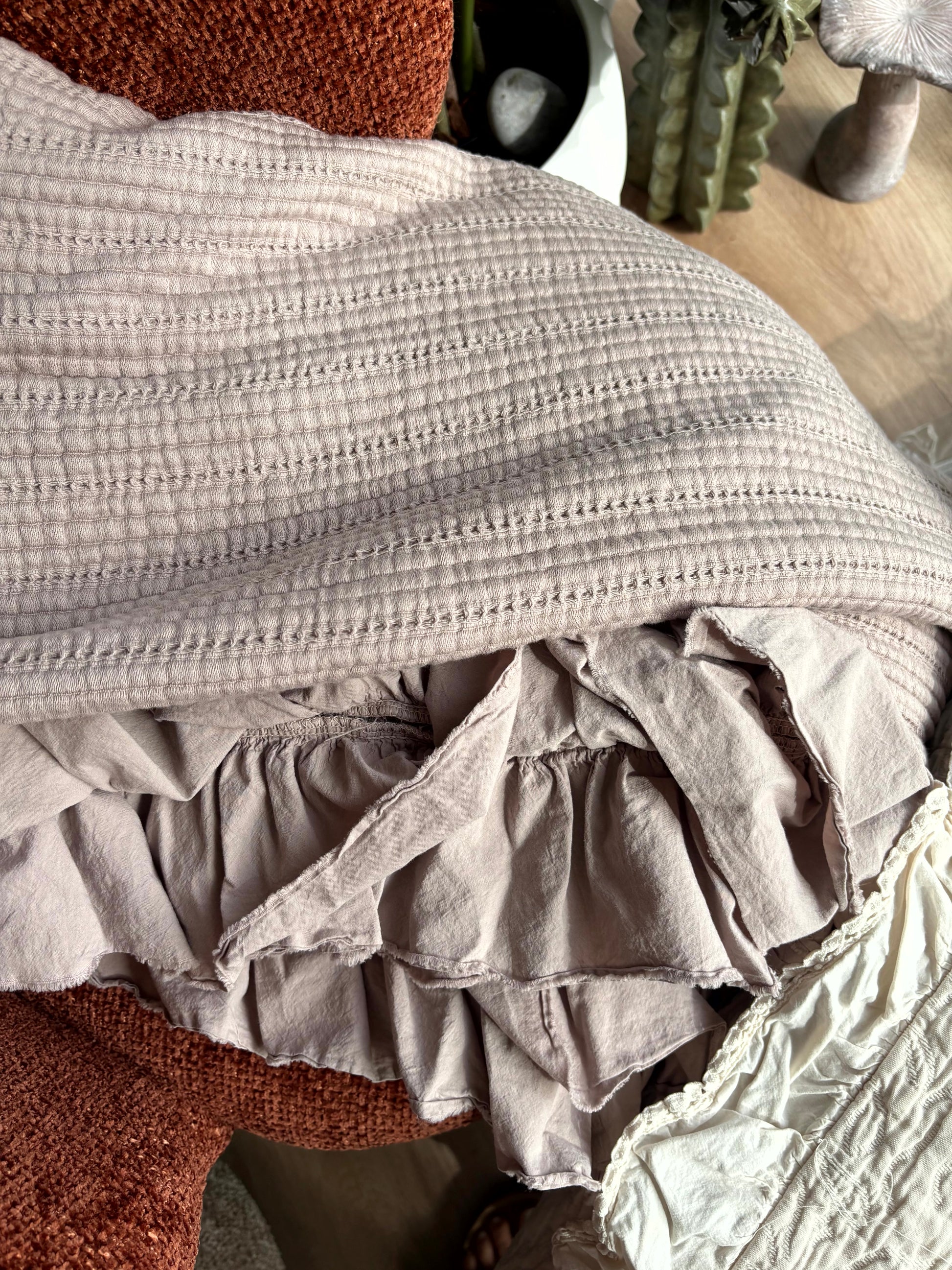 A Colcha Fontaine cor lilás distingue-se pela sua textura suave e acabamento com folhos, que acrescenta movimento e um charme naturalmente romântico ao quarto. A tonalidade neutra cria uma base serena e acolhedora, perfeita para ambientes tranquilos e luminosos.