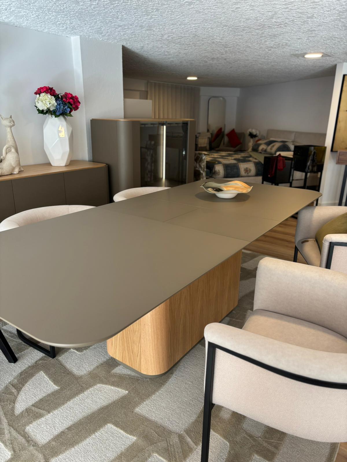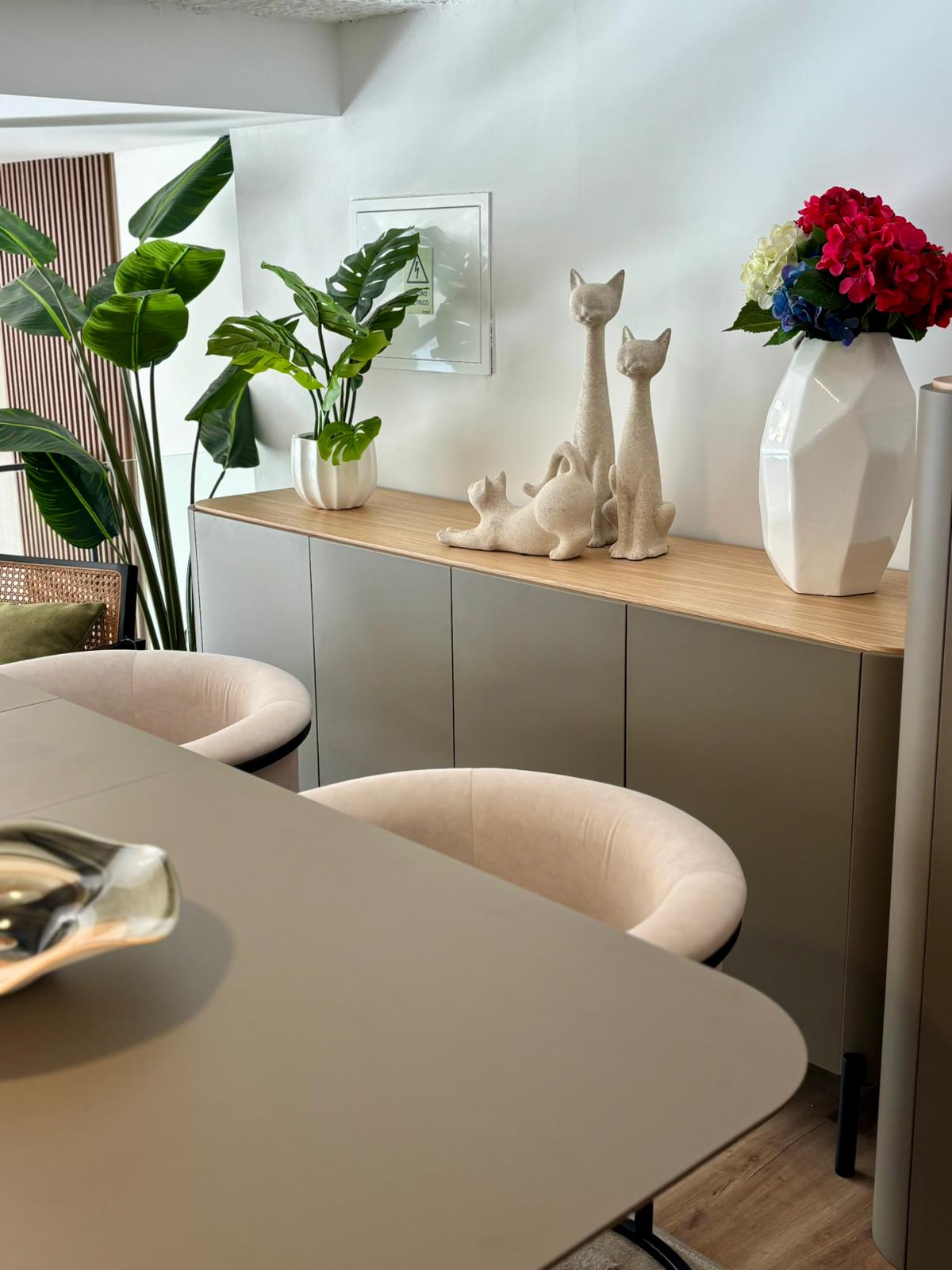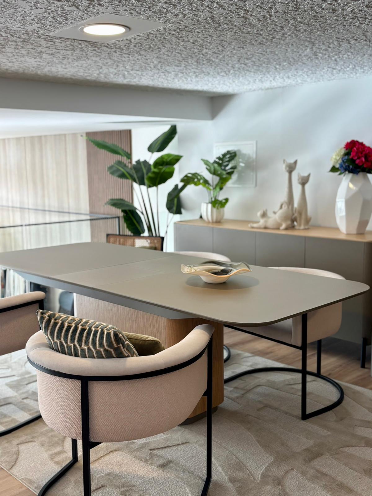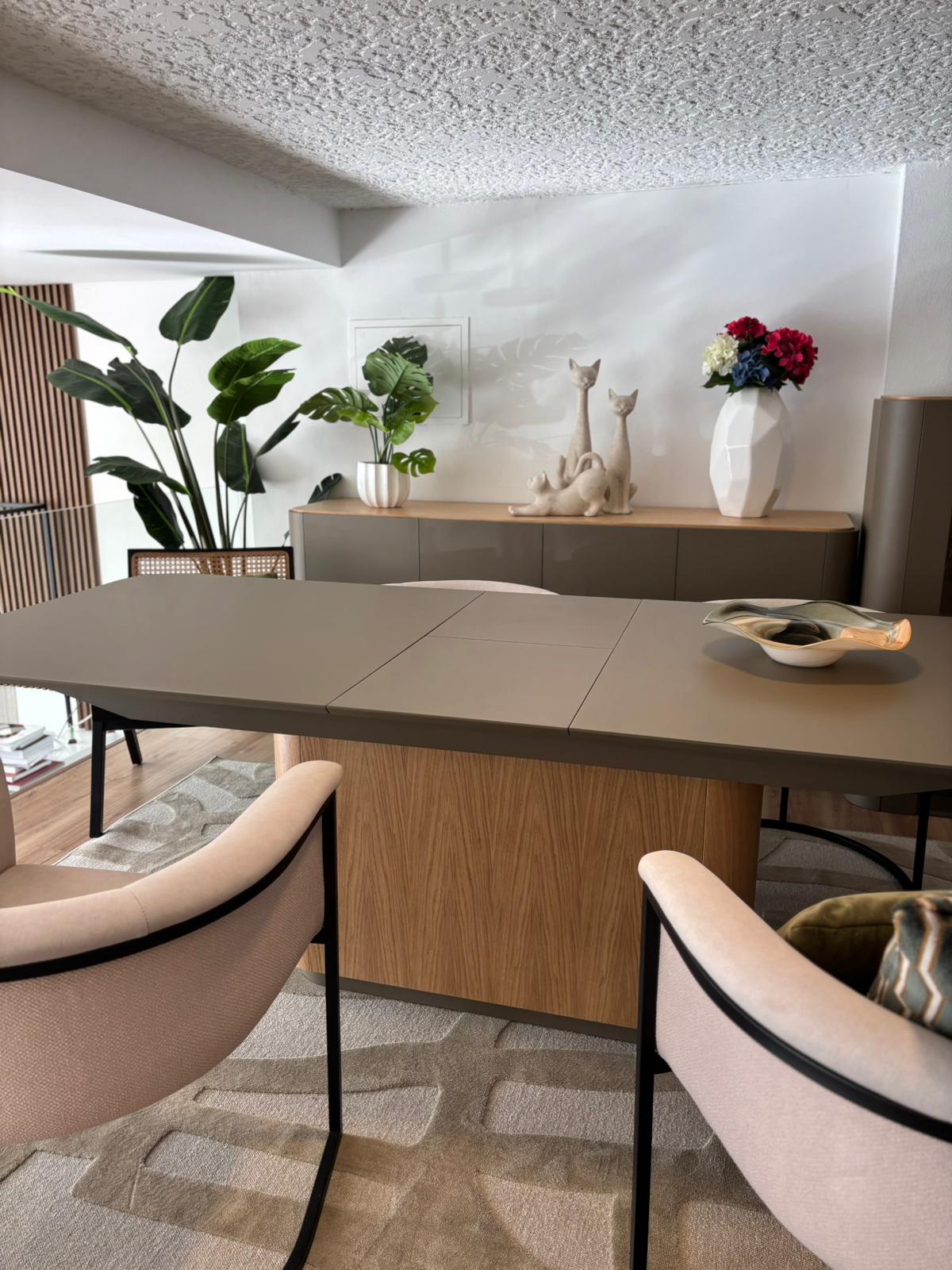 A mesa de jantar extensível oferece versatilidade e conforto, adaptando-se facilmente a diferentes momentos do dia a dia. O aparador, o móvel de TV e o móvel bar acrescentam funcionalidade e organização, mantendo uma linguagem visual contínua e elegante em toda a divisão.