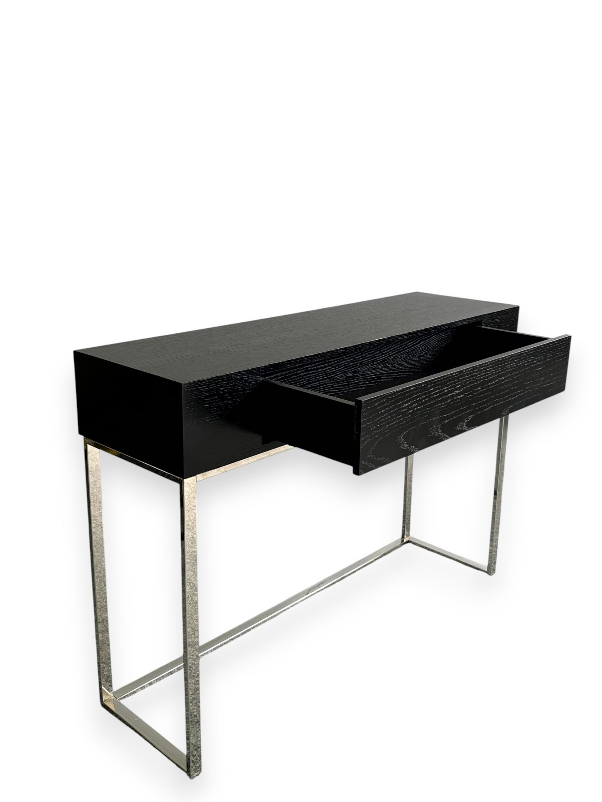 Com estrutura em tubo metálico e caixa de uma gaveta, destaca-se pela elegância das linhas retas e pela versatilidade nas opções de acabamento.