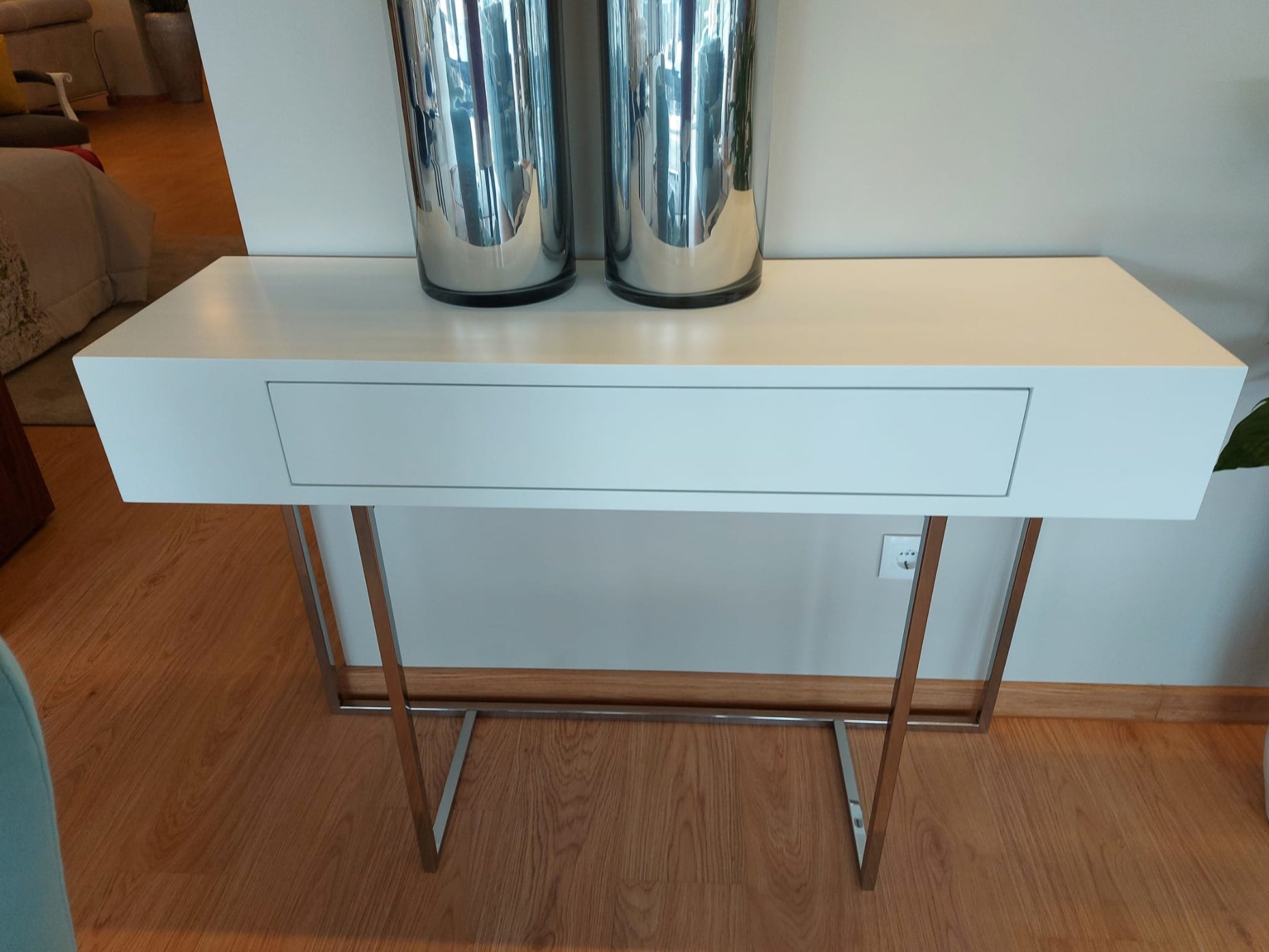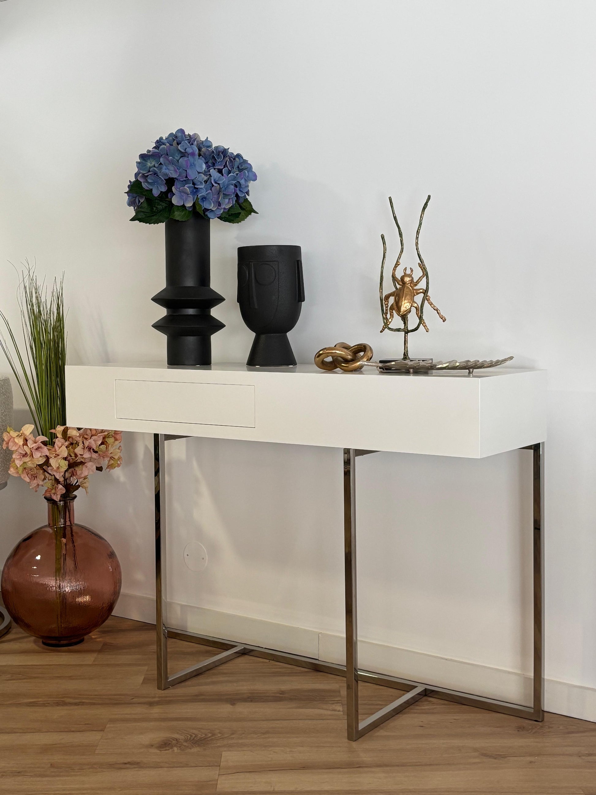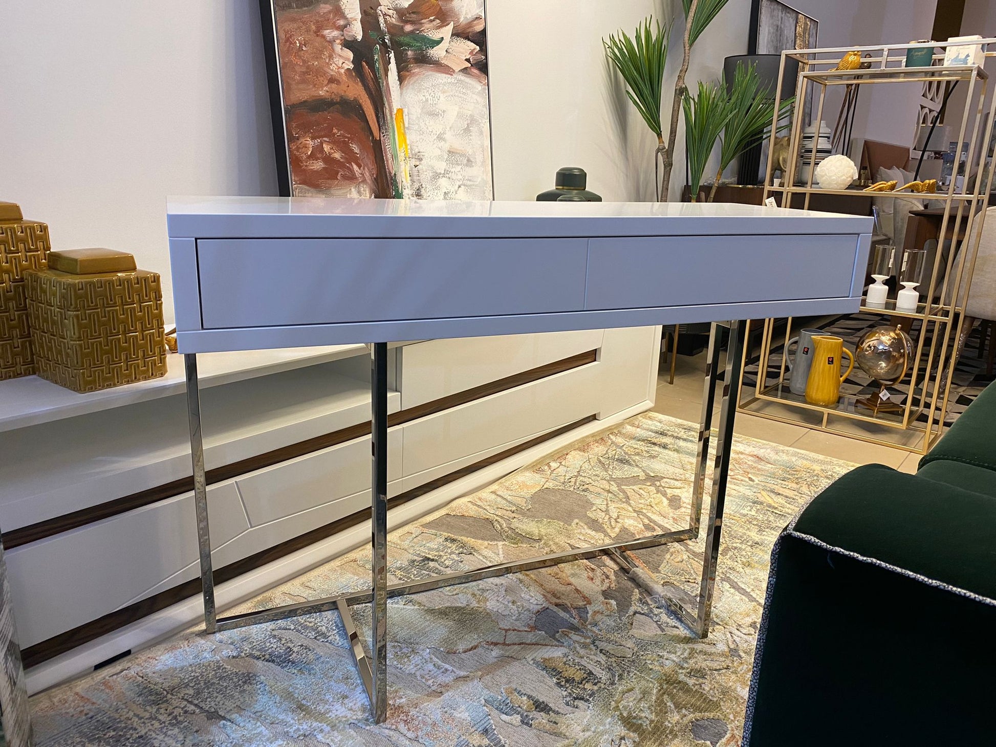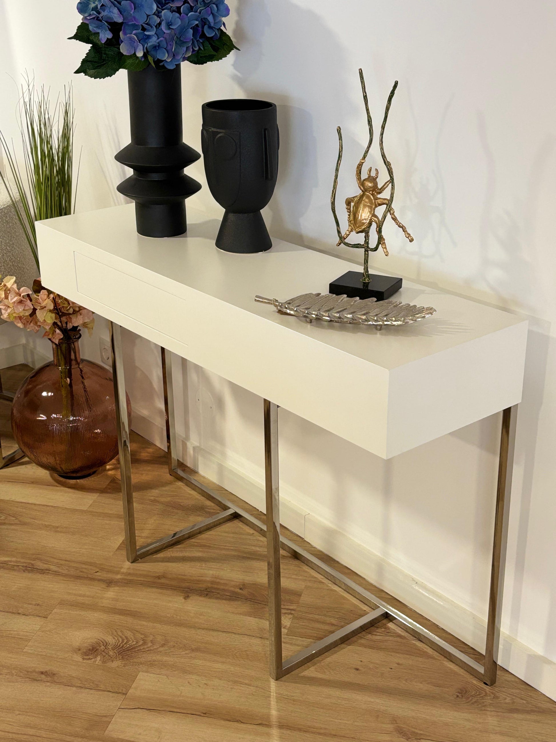 Uma consola de linhas assimétricas e design elegante, pensada para ambientes contemporâneos que valorizam equilíbrio e distinção. Disponível com estrutura em inox polido ou ferro pintado , a Versat oferece ainda espaço central para integrar um puff, aliando funcionalidade a uma estética apurada.
