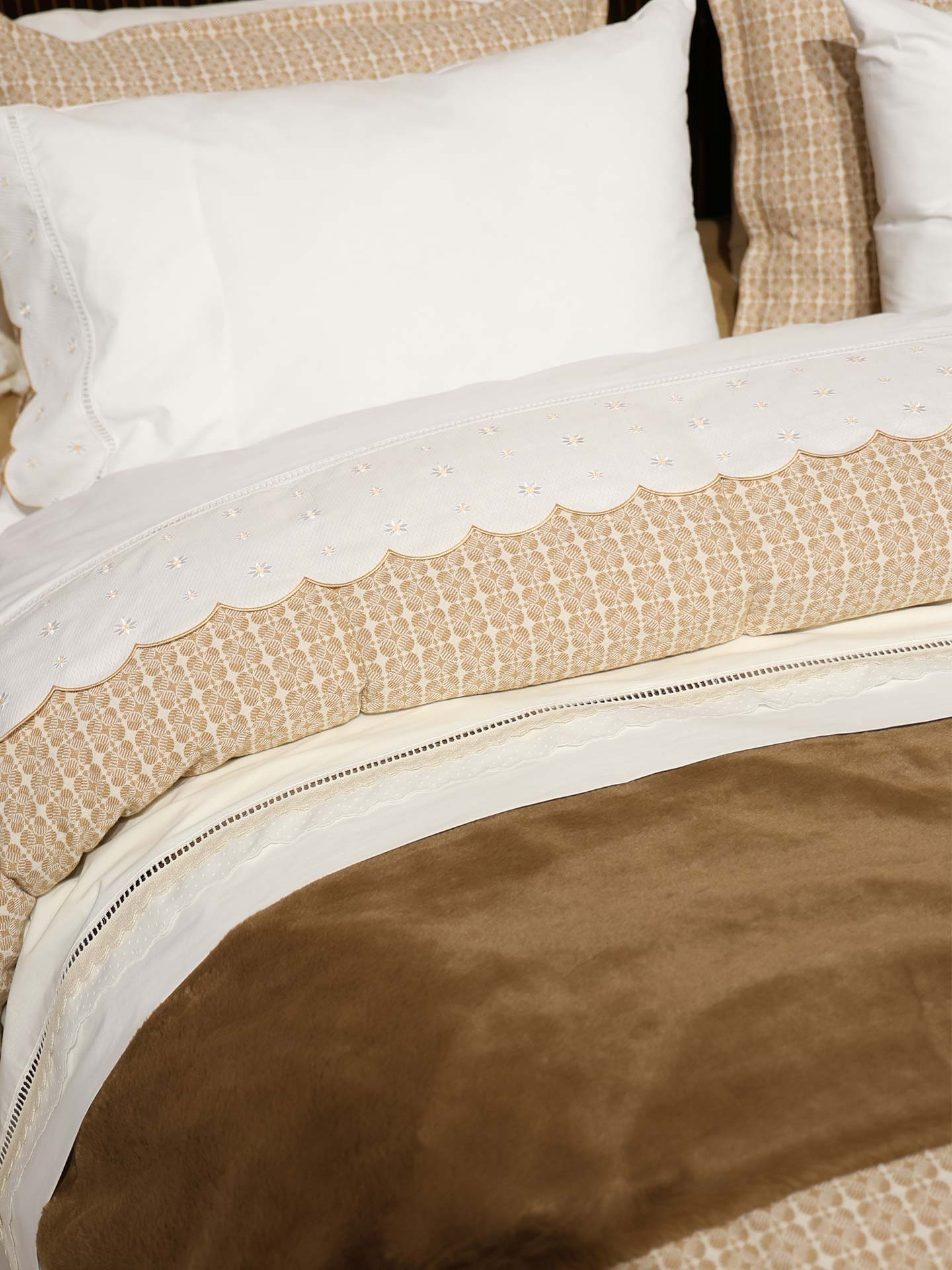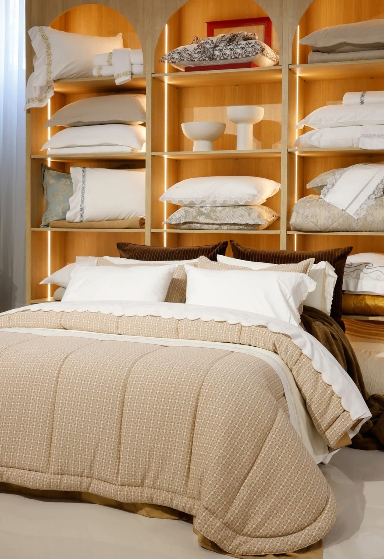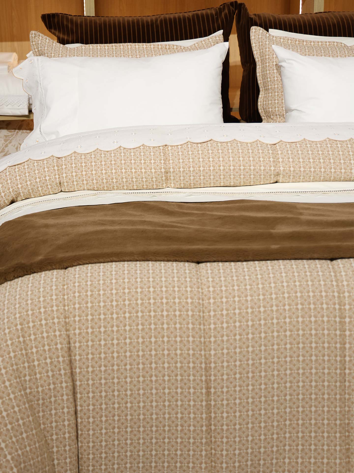 Edredão acolchoado. Tecido com padrão geométrico repetido em toda a superfície. Inclui fronhas de almofada coordenadas com o mesmo tecido. Fronhas de almofada com rebordo.
