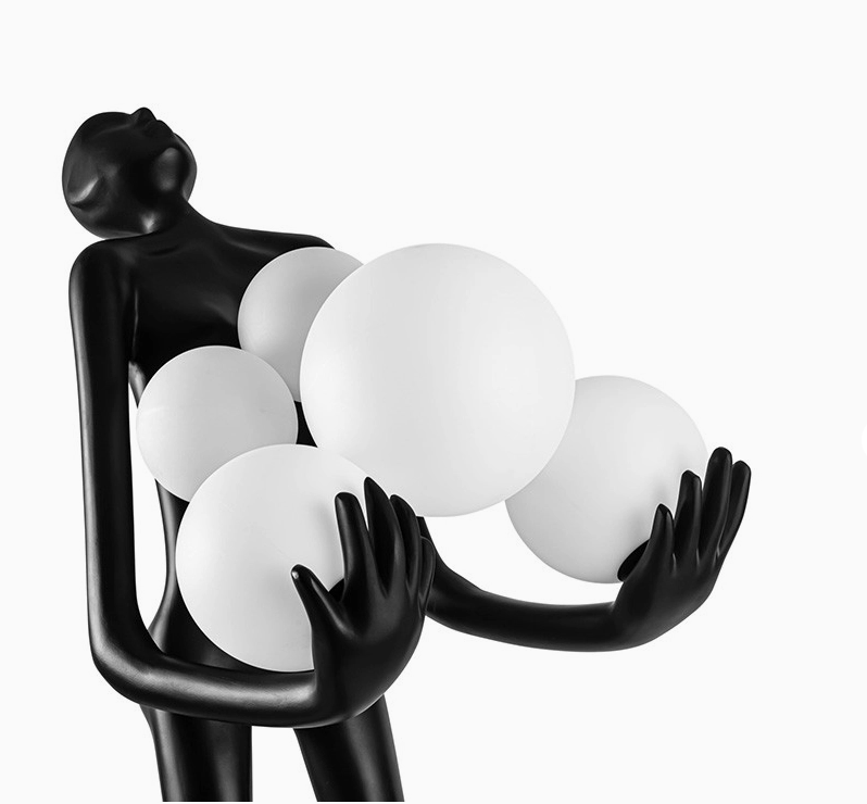 Com 1,80 m de altura, esta figura iluminativa segura esferas luminosas que parecem flutuar, criando um equilíbrio perfeito entre arte contemporânea e iluminação ambiente.