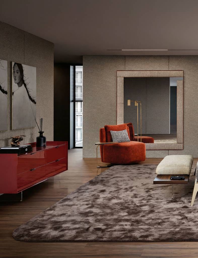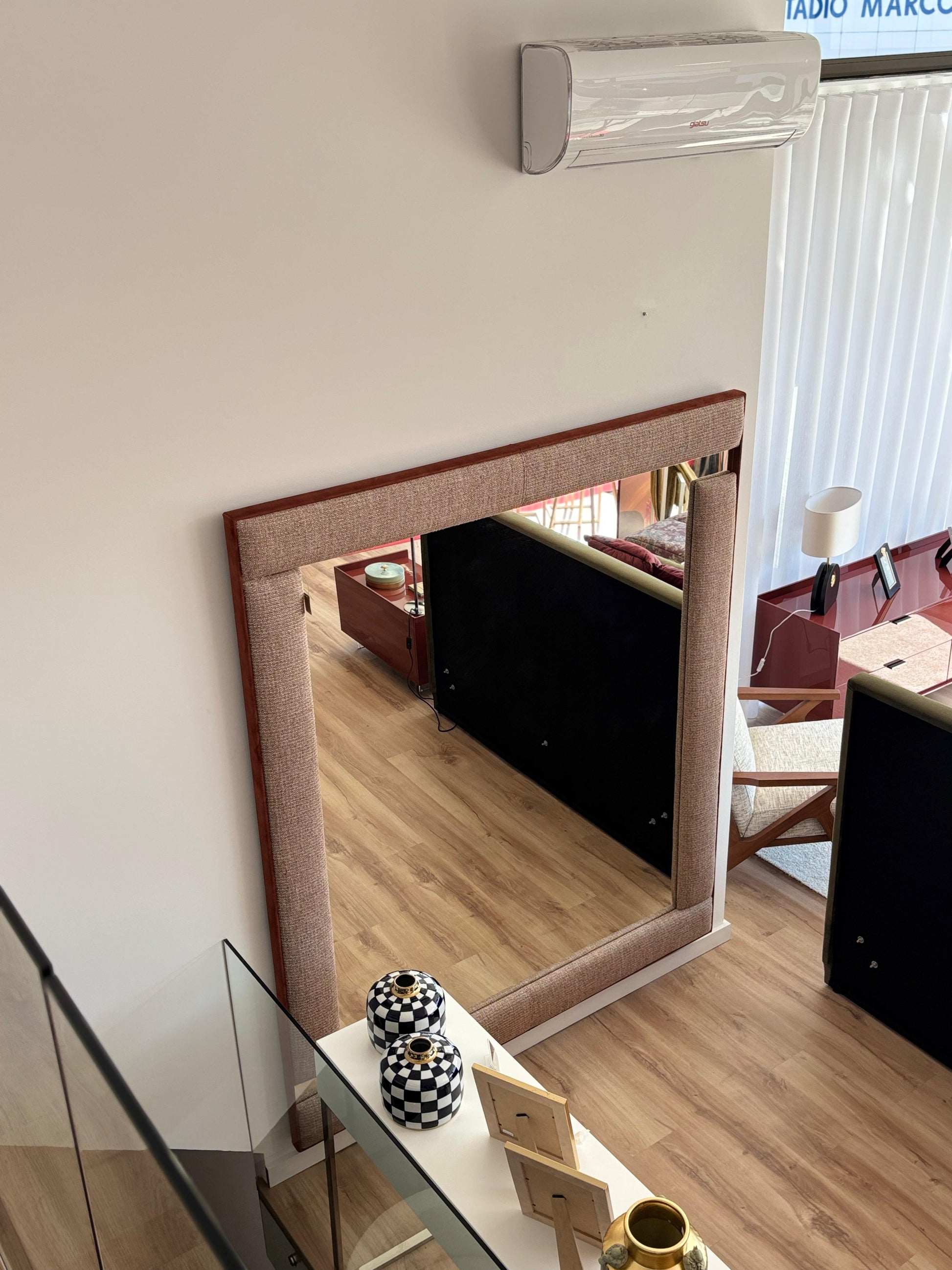 O Espelho Lynn introduz presença estética no espaço com a sua moldura estofada e expressão visual envolvente.