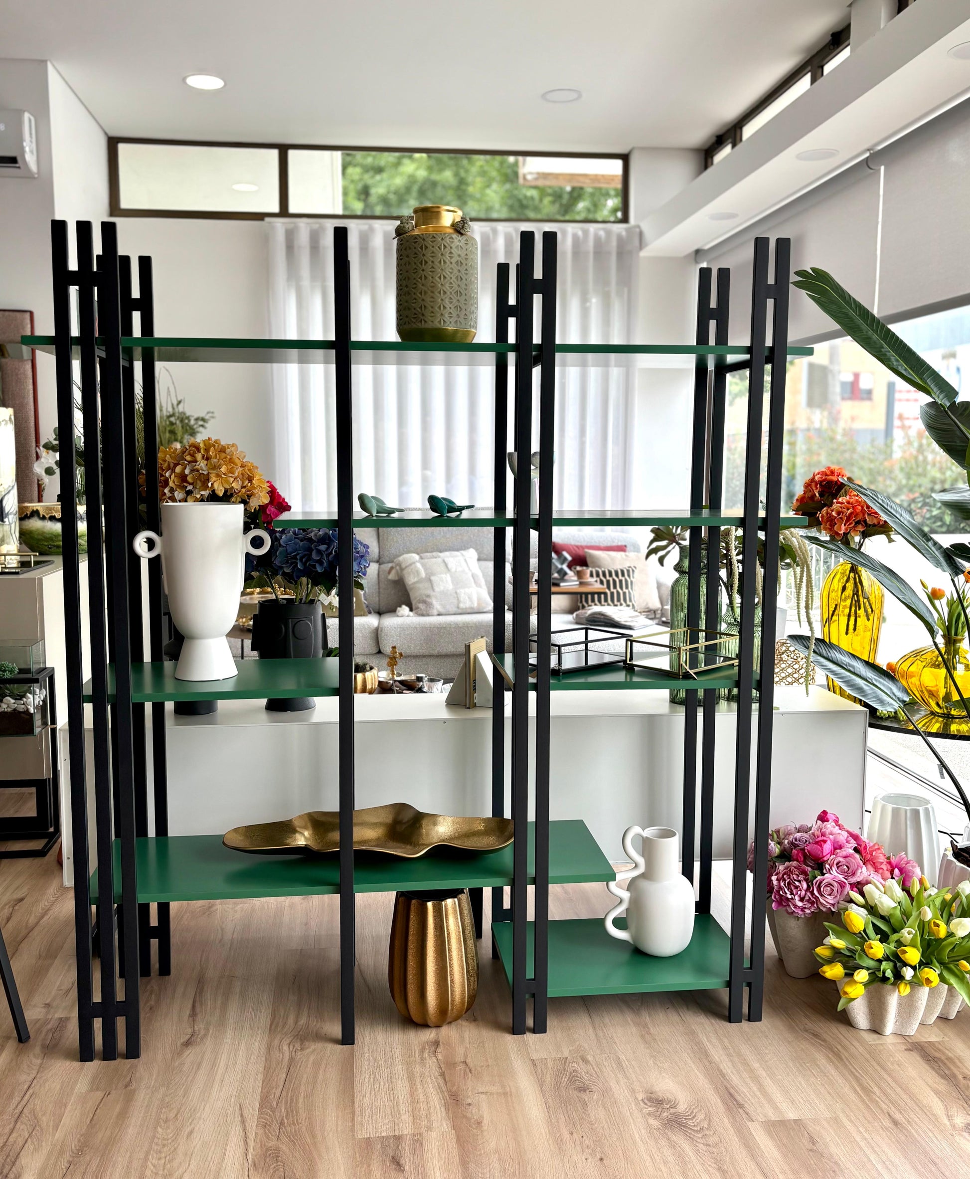 A sua estrutura vertical em ferro preto e as prateleiras lacadas conferem leveza visual, permitindo destacar livros, objetos decorativos ou coleções sem sobrecarregar o ambiente.