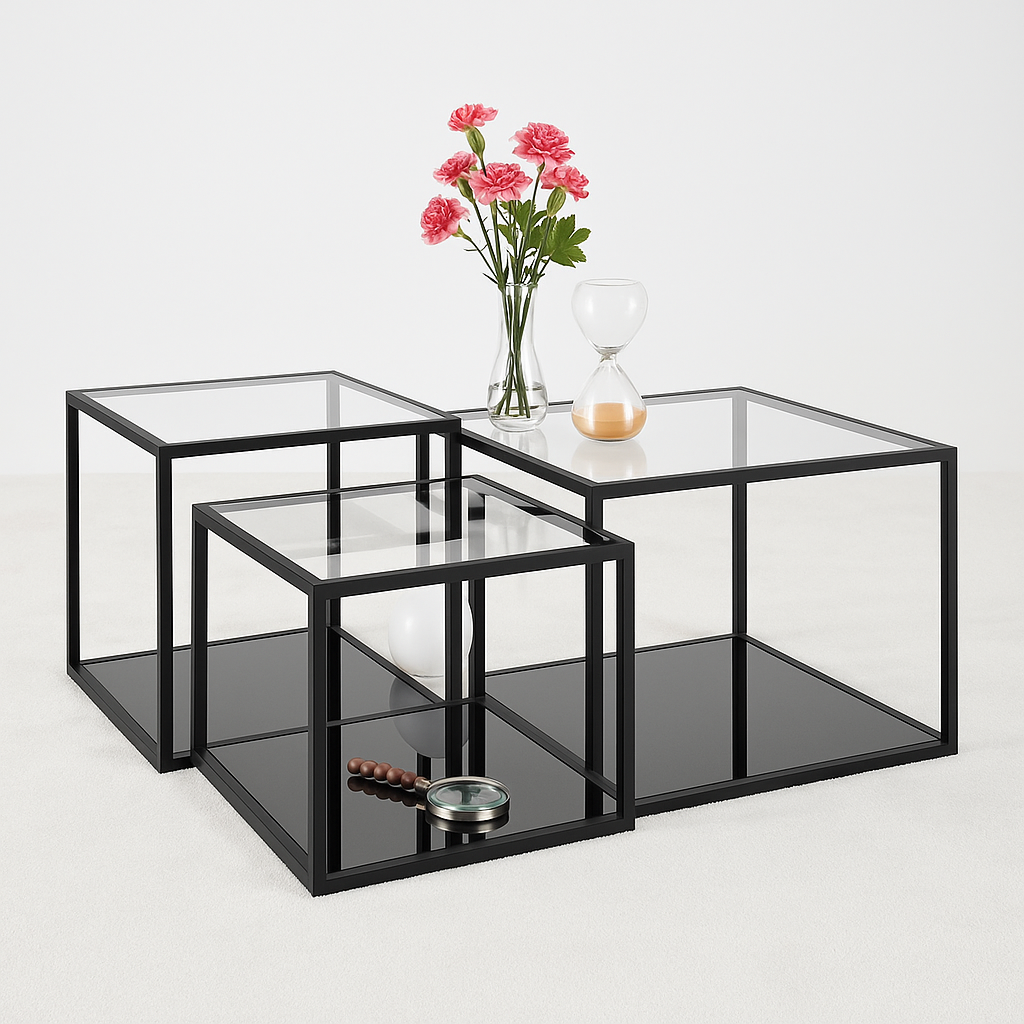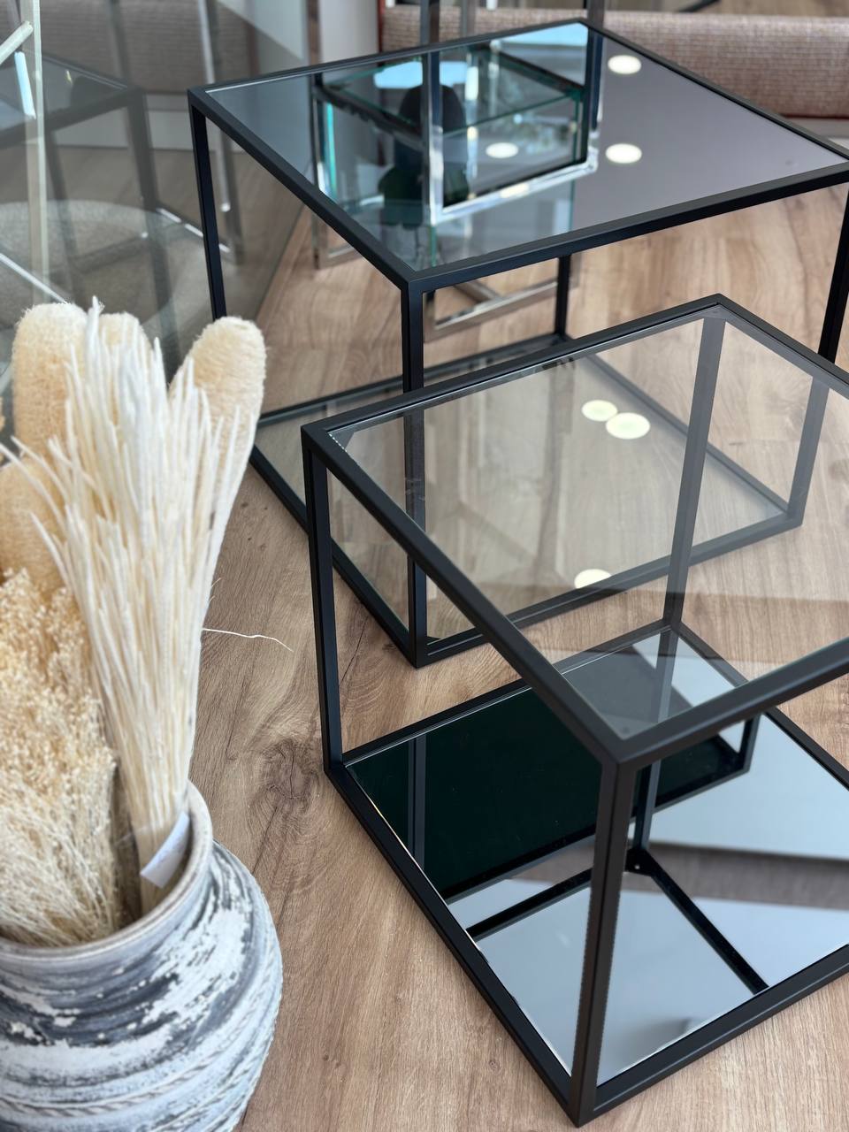 As Mesas de Apoio Koria destacam-se pela sua estrutura geométrica em ferro e tampos em vidro e espelho gris, criando um visual limpo mas moderno e contemporâneo.