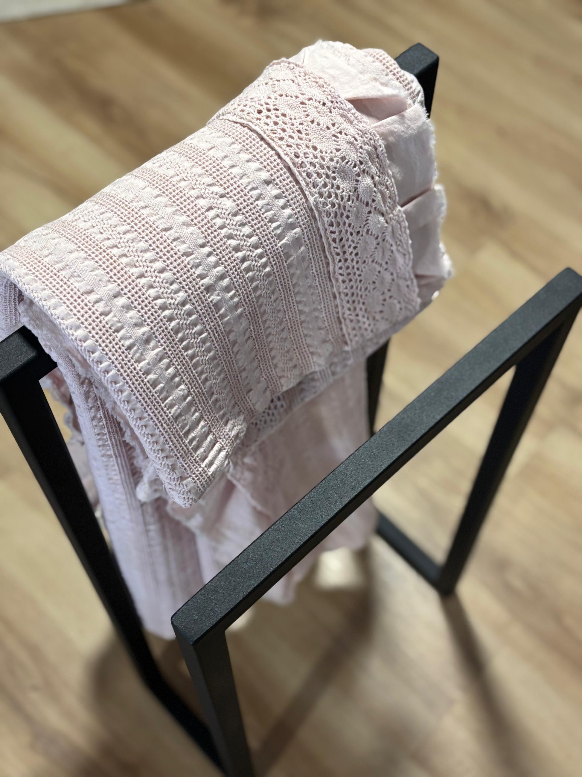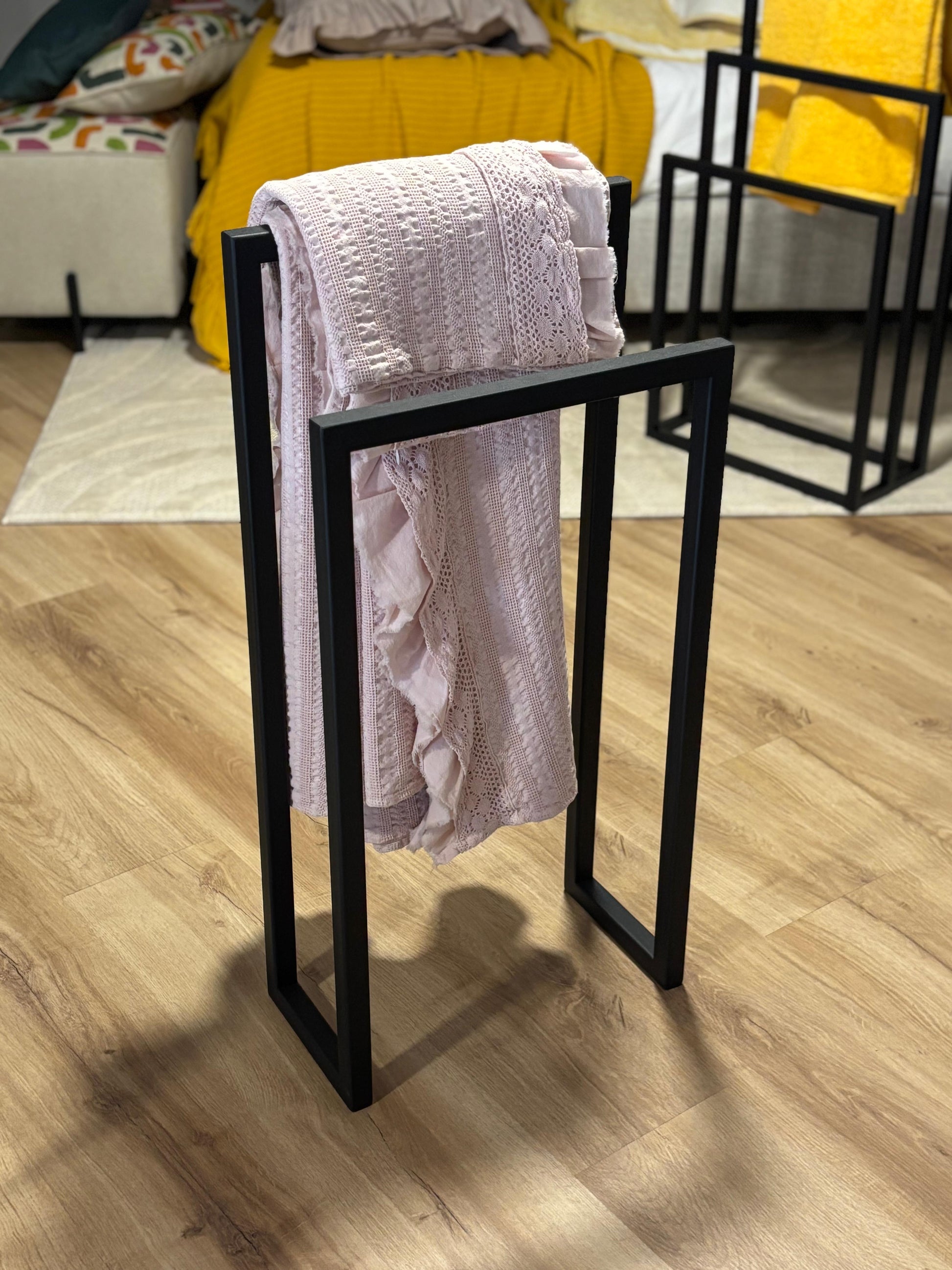 O Porta-Toalhas Ule destaca-se pela sua forma retangular depurada, oferecendo uma solução funcional e visualmente leve para organizar toalhas no quarto de banho.